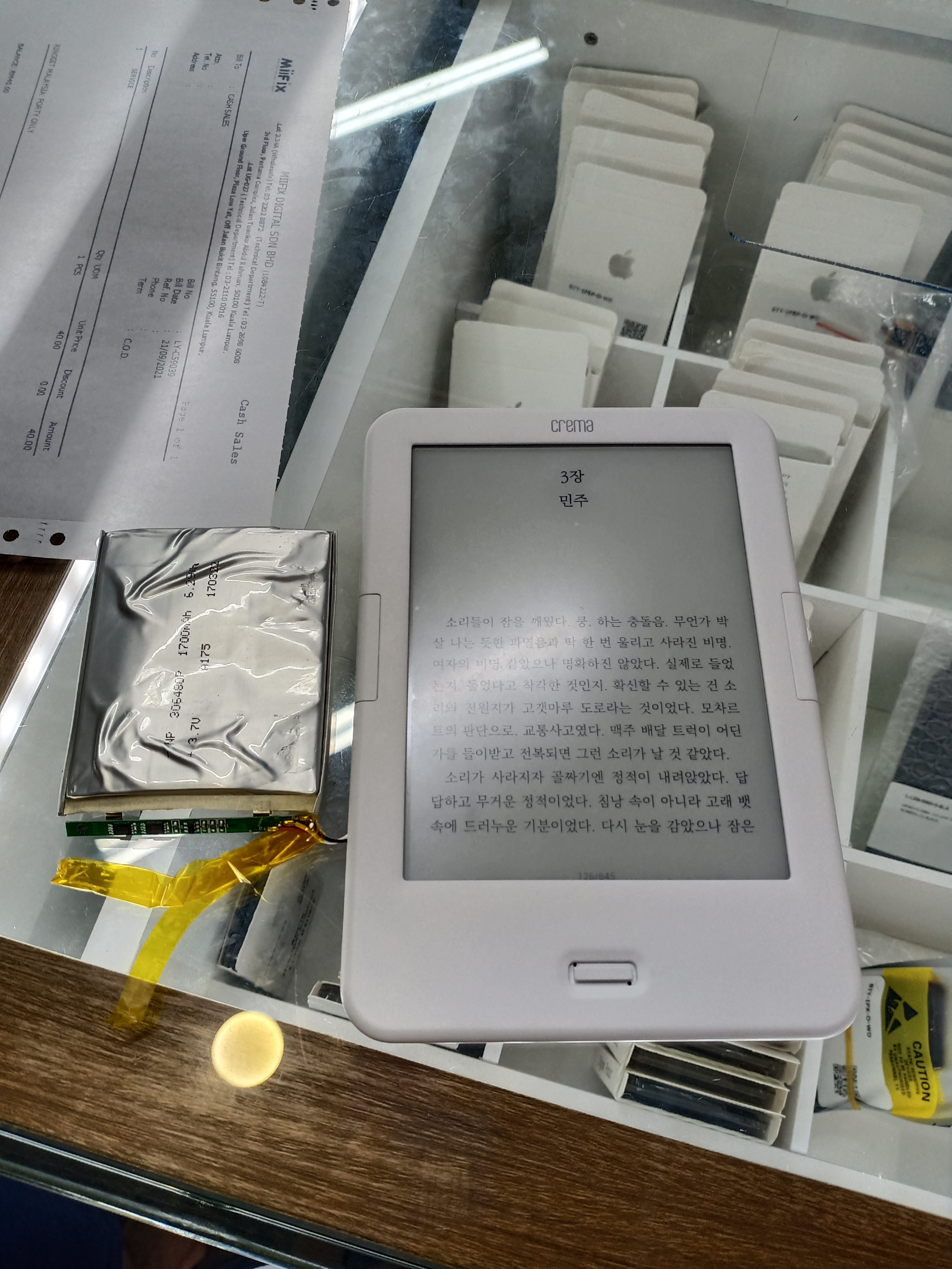 얼마 전부터 크레마 사운드의 배터리가 조금씩 빨리 소진되는가 싶더니 최근에 들어서는 말 그대로 배터리가 광탈하기 시작했다. 1분에 거의 5%씩 떨어지는 지경에까지 이르러서 완충해도 채 30분을 볼 수 없게 되었다. 새로운 전자책을 구매해야 하나 싶기도 했는데 현재 외국에 살고 있기도 하고, 배터리 외에 다른 문제가 전혀 없는 터라 셀프로 배터리 교체가 가능한지 검색하기 시작.