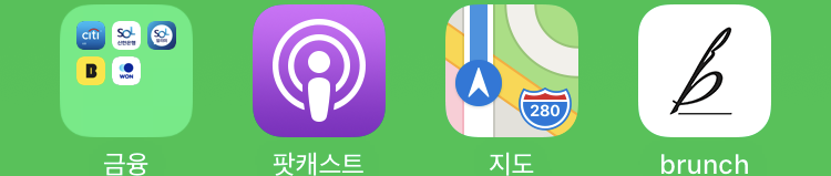 아이폰 팟캐스트 어플은 기본적으로 깔려 있는 앱인데 왼쪽에서 두 번째 보라색 모양이 바로 팟캐스트 앱이다. 저걸 실행시키면 이미 절반은 성공! 내 경우에는 국가 설정이 외국으로 되어 있어서 외국어로 나오긴 하는데 보통은 '둘러보기'섹션이 한국어로 되어있어서 거기에서 다양한 팟캐스트들을 볼 수 있고, 카테고리별로 보면 인기 팟캐스트를 순위대로 확인할 수도 있다.