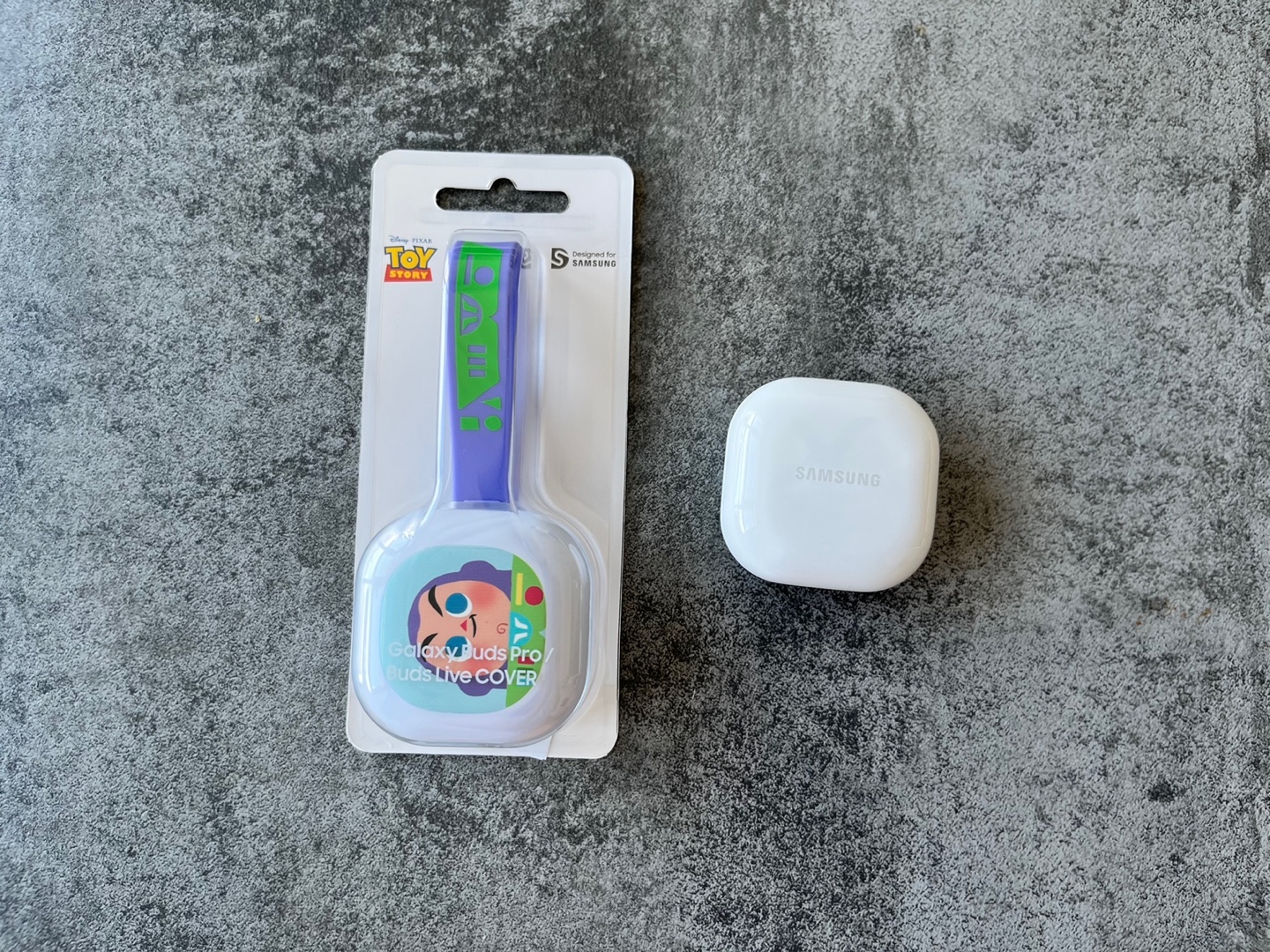 케이스에 끼우면 요렇게! 토이스토리 버즈 케이스랑 갤럭시 버즈2 보라색이 아주 찰떡처럼 잘 어울린다. 옆에 달린 건 스트랩으로 쓸 수도 있고,