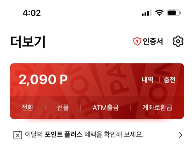 어플 하단 '더보기' 로 들어가면 본인에게 적립된 포인트를 확인할 수 있다. 포인트는 결제 외에 총 네 가지 방법으로 사용이 가능한데