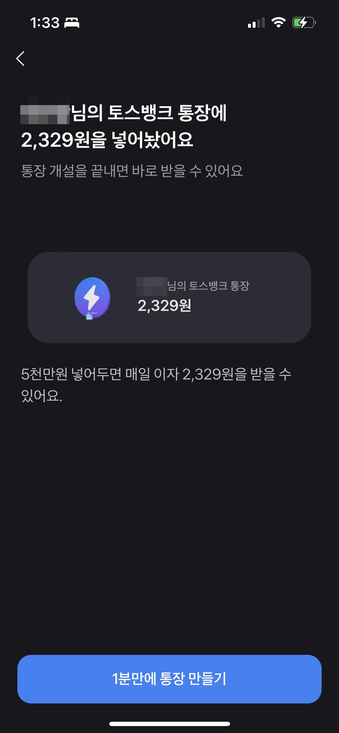 내 경우에 큰돈을 예치할 목적이 없고, 자유 입출금용으로 쓸 통장을 원하기 때문에 1억 이하 이율이 2.0%인 토스뱅크가 더 적합하다는 생각이 들었다. 그리고 현재 토스뱅크에 신규 가입을 하면 이벤트로 가입축하금을 랜덤으로 지급하는데 나는 2,329원을 보너스로 지급받았다! 이 이자는 토스 뱅크에 5천만 원을 예치했을 때 매일 받을 수 있는 이자 금액이라고! ㅎㅎ